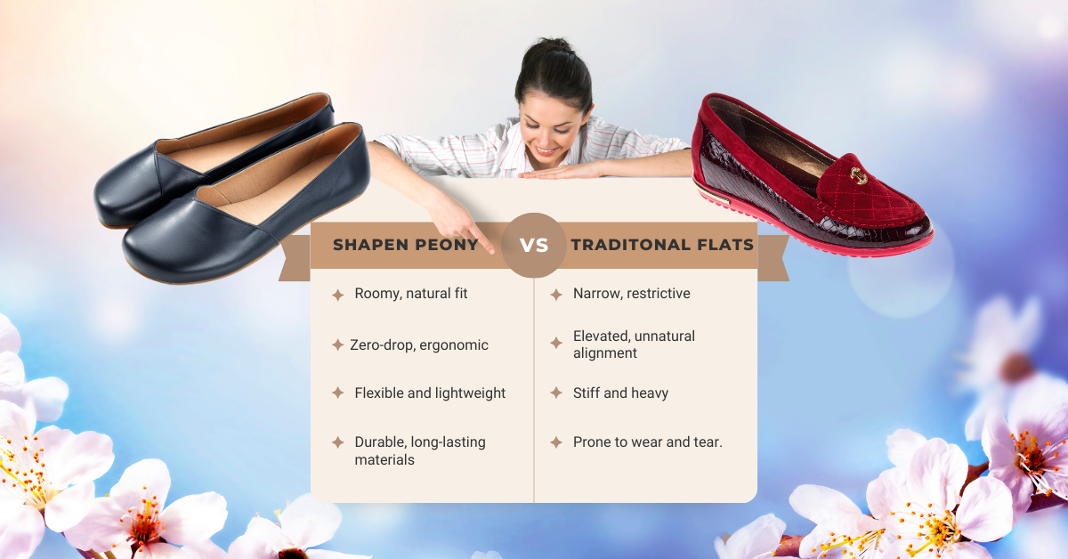 Experience the difference with Shapen PEONY Barefoot Flats. Unlike conventional flats that squeeze your toes and hinder your natural alignment, Shapen Flats are designed with a roomy toe box and a zero-drop sole to support healthy posture, natural movement, and all-day comfort.
